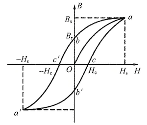 电机中使用的磁性材料一般包括永磁材料和软磁材料。永磁材料在外部磁场中产生磁性(磁化)后,将外部磁场撤去,因为磁畴方向的变动阻力较大,材料仍旧保留很强的磁性,真正的变成了“永久”的磁铁。而软磁材料磁畴变动阻力小,在外部磁场撤去之后即失去磁性。常用的永磁材料有钕铁硼、铁氧体等,常用的软磁材料有硅钢、铁等。 如果将磁性材料置于周期变化的磁场中,材料内部的磁感应强度的变化会存在一定的滞后,材料内部的磁感应强度和外部磁场强度的变化形成一个闭合的曲线,称为磁滞回曲线(图1)。O-a的过程称为初始磁化曲线;a-b过程,外部磁场强度降到0,材料内部仍保留磁感应强度Br,称为剩磁;b-c'过程,需要施加一定反向磁场强度才能将材料内部磁感应强度清零,这个磁场强度就是矫顽力Hc;