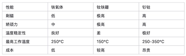 在电机中,永磁材料可以替代电流励磁产生恒定的磁场,从而达到更高的电机效率。实际应用中我们总是希望永磁材料磁性更强、更稳定,结合前文关于磁滞回线的内容,也就是需要永磁材料的剩磁高、矫顽力大。下表列出了常见的永磁材料性质。