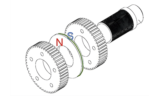 混合式步进电机转子结构如图5 所示,一组转子是由两个相互错开的带齿转子铁心夹住一块轴向充磁的永磁体构成,两个转子铁心分别是N极和S极,从而形成了圆周上相互交替的N极和S极齿。