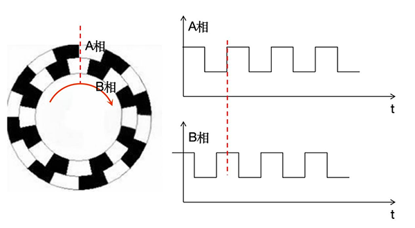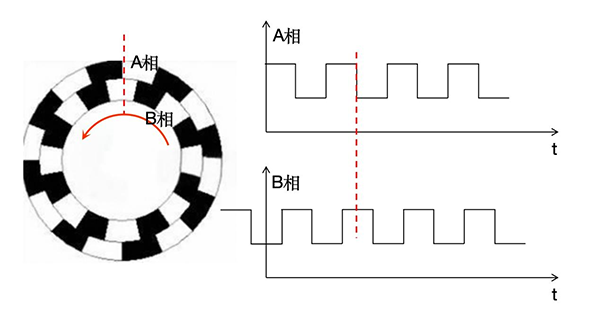 2.方向。再加一组相位相差90°(电角度)的光栅就可以达到这个目的了(两个光栅可以集成在一个圆盘上,如图2)。不难发现,顺时针旋转时(图3),A相信号的上升沿(低电平—高电平,或者说是暗—亮 )总是对应B相的高电平状态(亮);反过来,逆时针旋转时(图4),A相信号的下降沿总是对应B相的高电平状态(亮)。这样就可以判断旋转方向了。