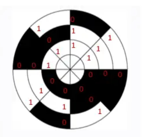 如果我们想不依赖零点就能确定位置信息怎么办呢,那就需要用到绝对值式编码器。原理也很简单,假如我们让整个圆周的每个细分区间的“图形”(或者说编码)都不同就可以了。如图5所示的绝对值式码盘,可以看到码盘是同心圆结构,每个同心圆称为一个码道,然后将圆盘均分成N份,那么360°/N就是绝对值编码器的精度。