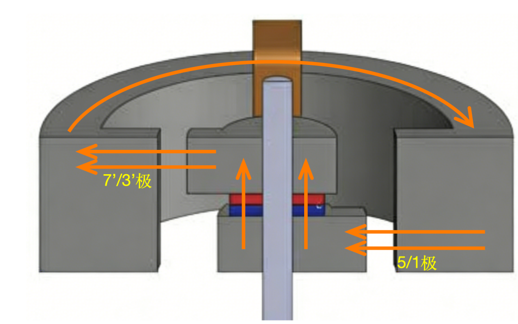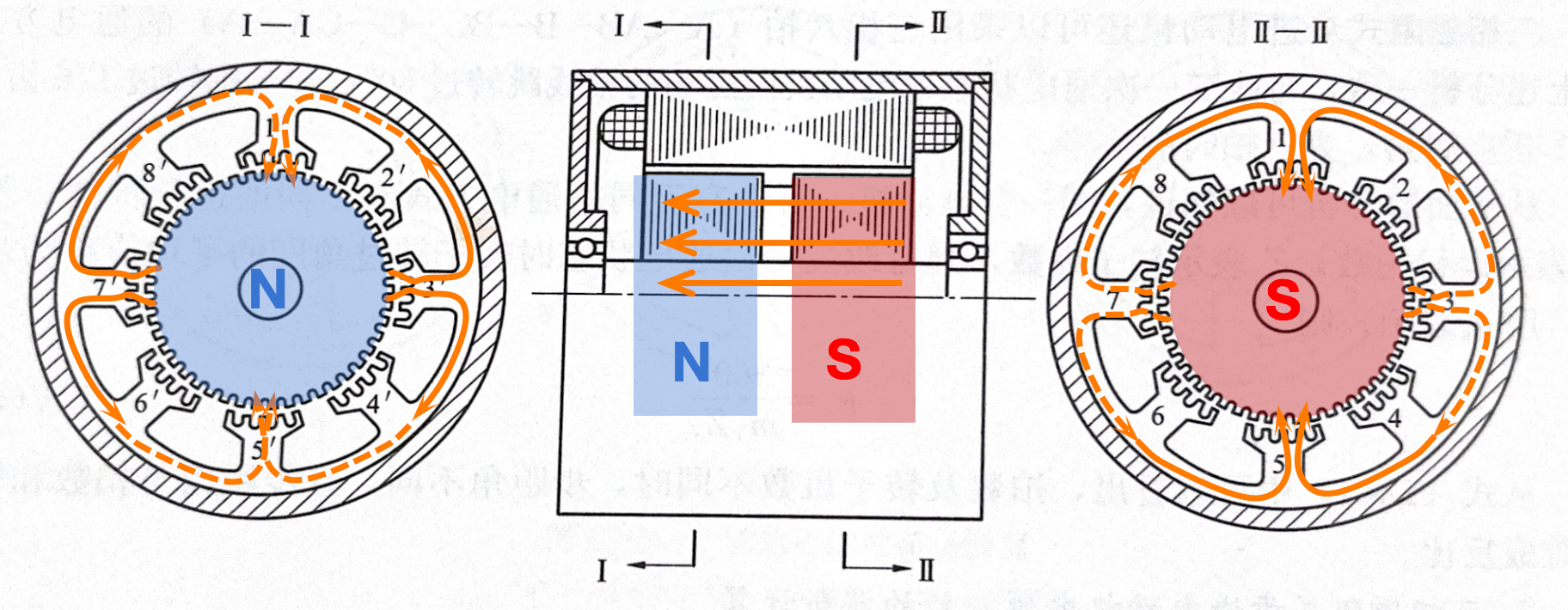 再从(I)侧观察,N极转子的的磁力线将朝着7’、3’两极(S极)方向汇聚,经过对齐的定转子齿之间的气隙进入定子,然后再经过定子铁芯外围回到1、5两极。这里可以看到磁路经过的两段气隙都是齿与齿对齐的最小磁阻路径——(II)侧的1和5以及(I)侧的7’和3’。图5从立体的视角更加清晰地表现了混合式步进电机运行时的合成磁路的情况。